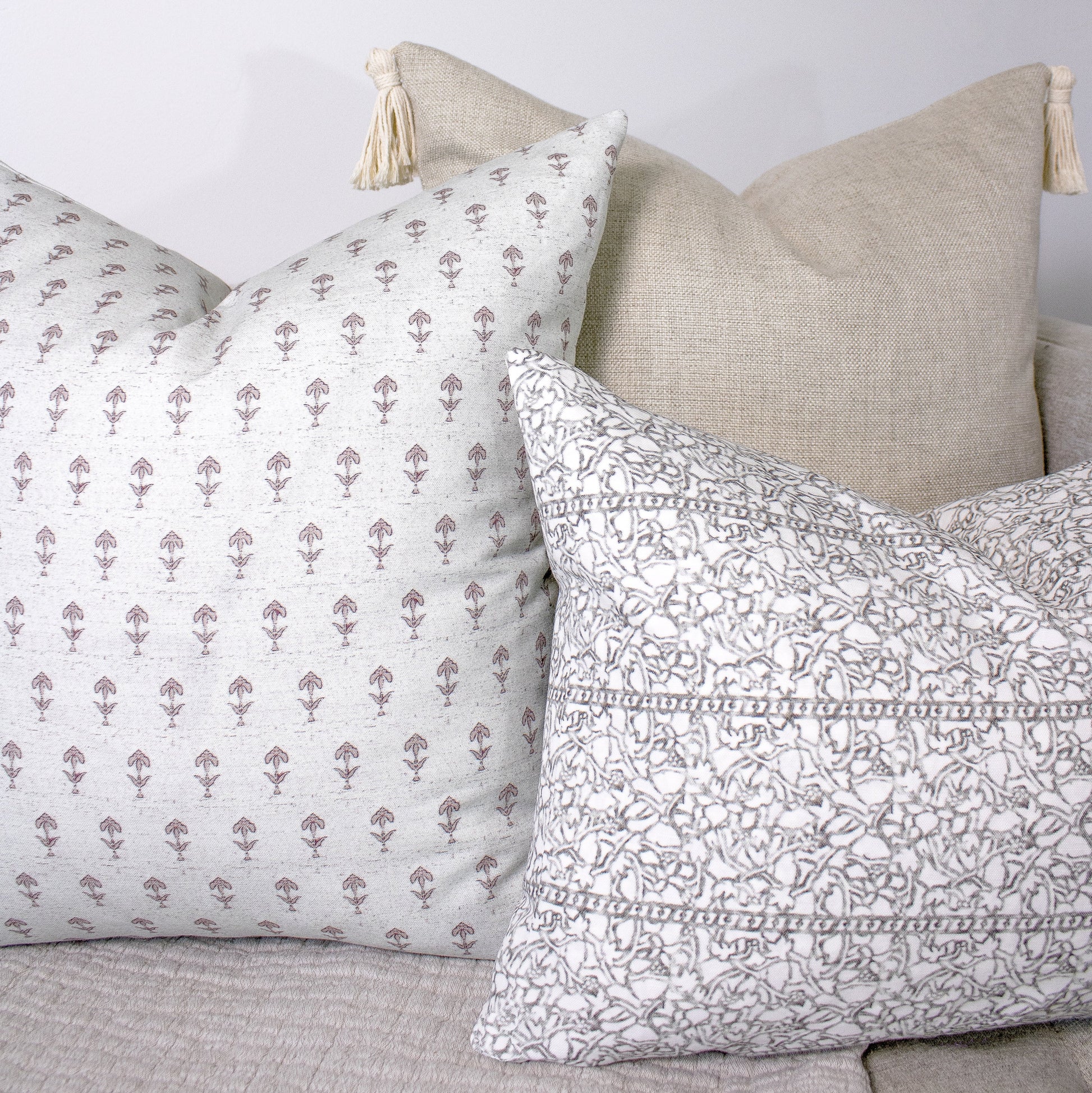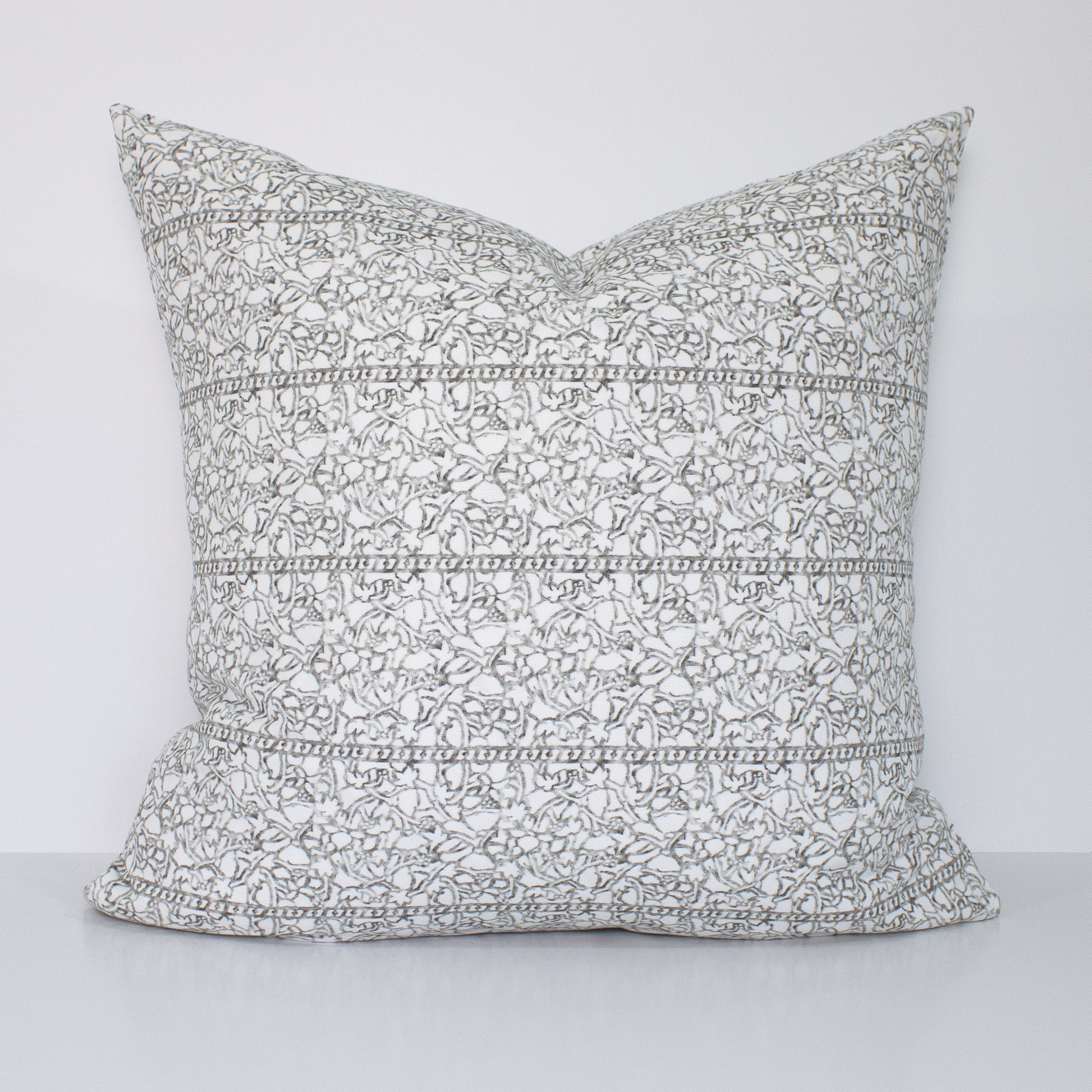 A delicate yet structured design, Faye in Clay features an intricate floral motif in warm white set against a soft charcoal background. This exclusive Notion Home print blends classic charm with refined detail, making it a versatile accent for any space.